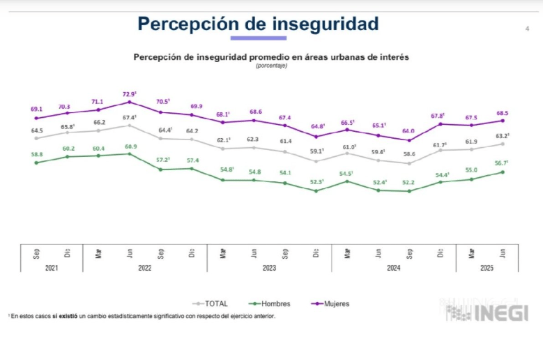 En junio de 2025, 63.2 % de la población de 18 años y más, residente en 91 áreas urbanas de interés, consideró que era inseguro vivir en su ciudad, la tasa más alta desde junio de 2022, cuando se registró un 67.4 %.