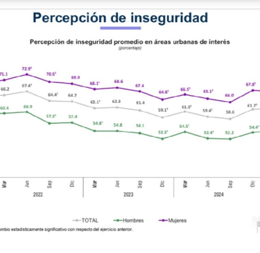Por género, la percepción de inseguridad fue mayor entre las mujeres con una tasa de 68.5 %, contra el 56.7 % de los hombres.