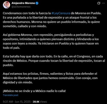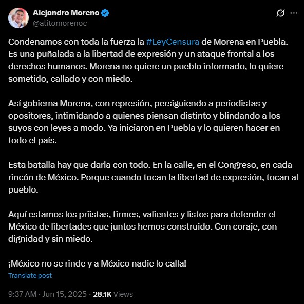 Alejandro ‘Alito’ Moreno, líder nacional del PRI, condenó la ley censura en Puebla y la calificó como “una puñalada a la libertad de expresión y un ataque frontal a los derechos humanos”.