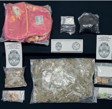 Durante un recorrido sobre la avenida Flor de Ciruelo, policías municipales observaron a un individuo que sostenía en sus manos varias bolsitas con aparente marihuana. En la inspección se aseguraron una mariconera y una mochila con 188 envoltorios con características de marihuana, cristal y piedra, así como un celular y un vehículo Chevrolet Aveo.