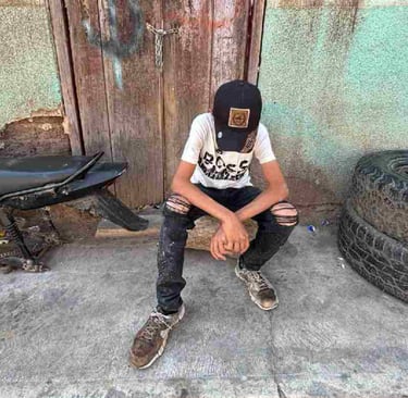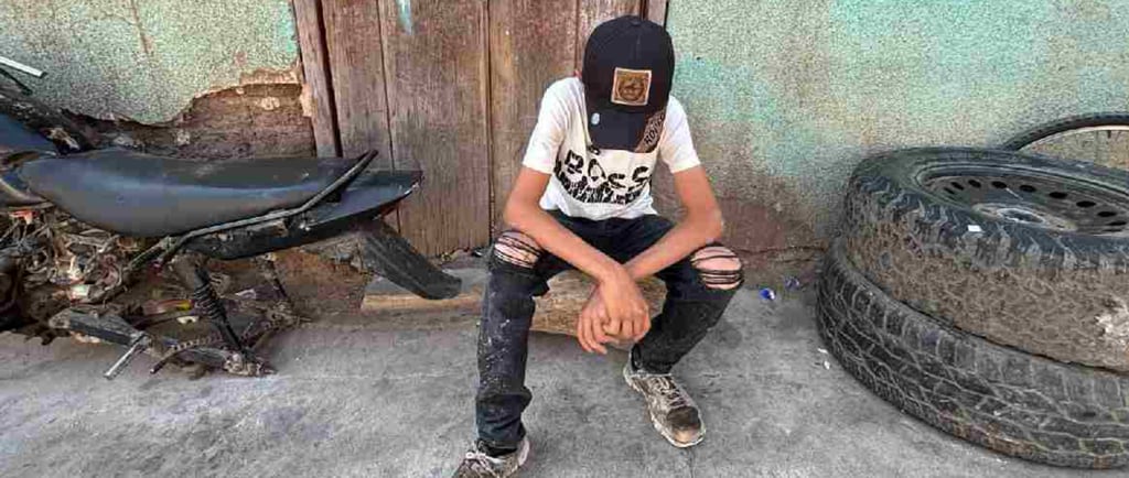 A su izquierda hay una moto desguazada, sin ruedas. A su derecha, un par de llantas de carro desgastadas, ya inservibles. Tiene los codos apoyados en las rodillas huesudas que sobresalen de los pantalones rajados, y la espalda recargada sobre la puerta herrumbrosa de una vieja casa abandonada, como él: sus padres —explicará más adelante— están vivos, pero no sabe de ellos, ni de su hermano. Vive solo, a su suerte, en casas ruinosas o en la calle; ahí donde la noche lo alcance. Nadie lo busca. No hay escuela, ni autoridad, ni familia que registre su ausencia.