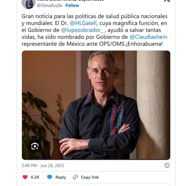 La presidenta Claudia Sheinbaum confirmó este lunes que Hugo López-Gatell, exsubsecretario de Salud, será representante de México ante la Organización Mundial de la Salud (OMS).